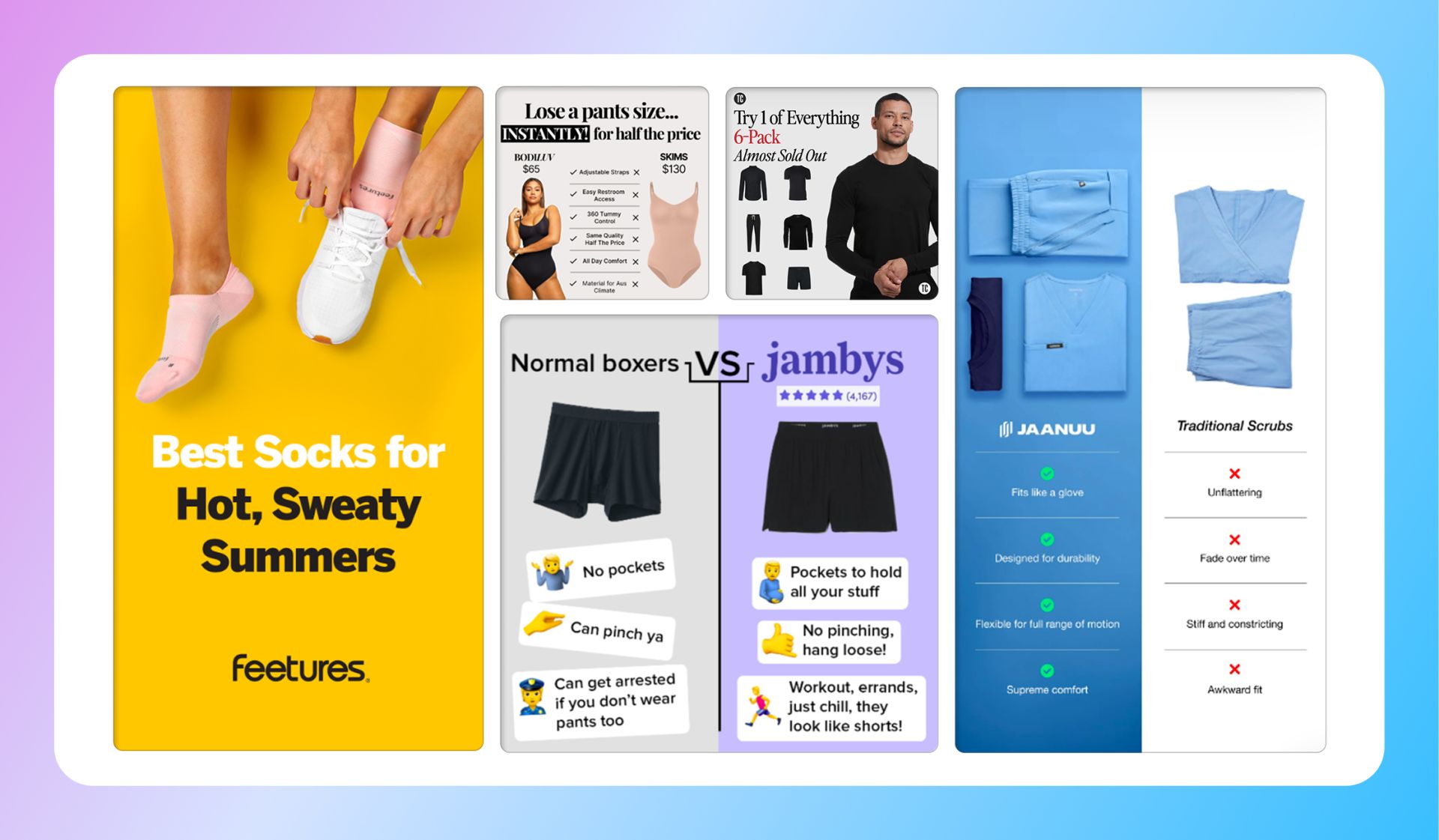 Deze ads benoemen directe productvoordelen met korte teksten en pijlen. Perfect om functies visueel te highlighten en vertrouwen of koopintentie razendsnel te verhogen.